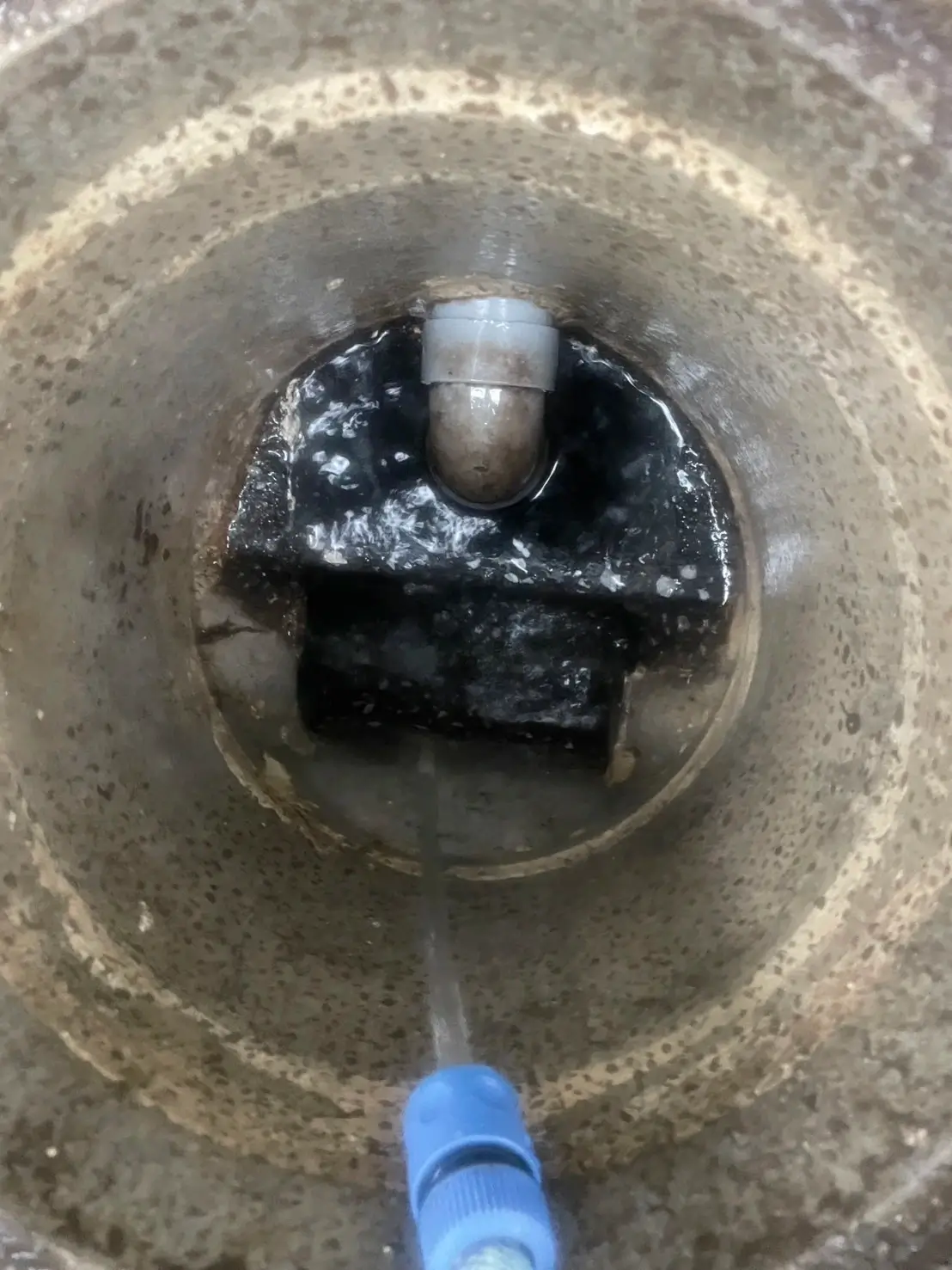 現場確認では排水桝内部に固形化した汚れや異物が蓄積し、さらに植物の根が侵入していたため水の流れがほとんど塞がれた状態でした。