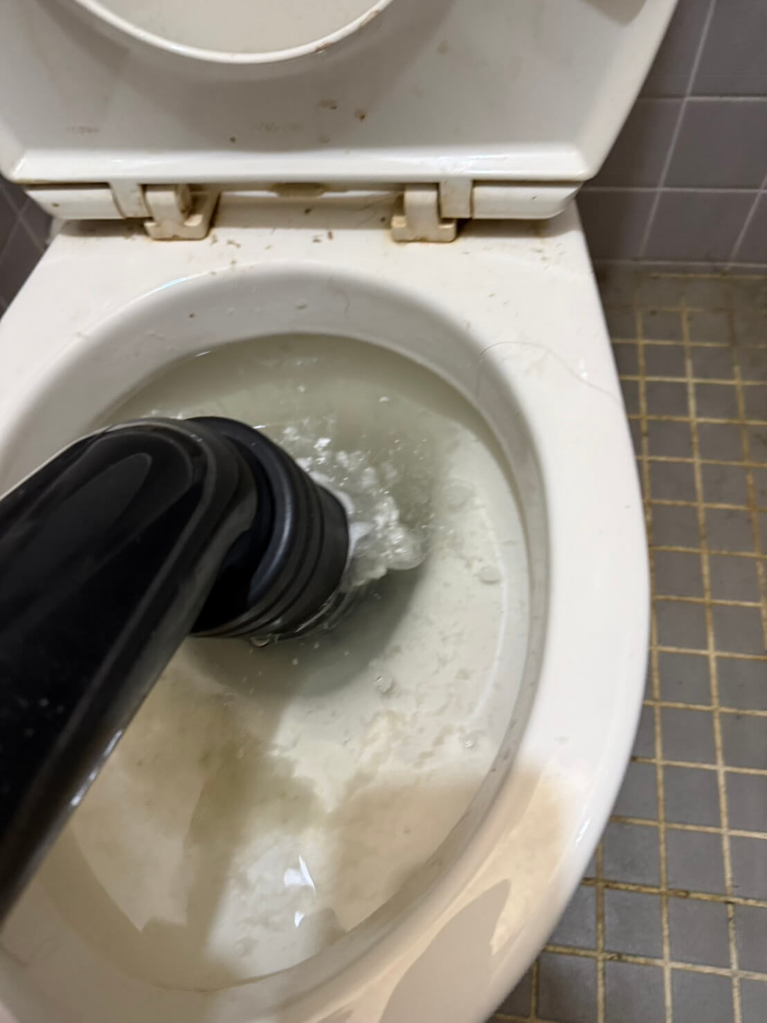 便器内の水位が高く、流れが著しく悪い状態であったため、まずは排水状況と詰まりの位置を慎重に確認しております。