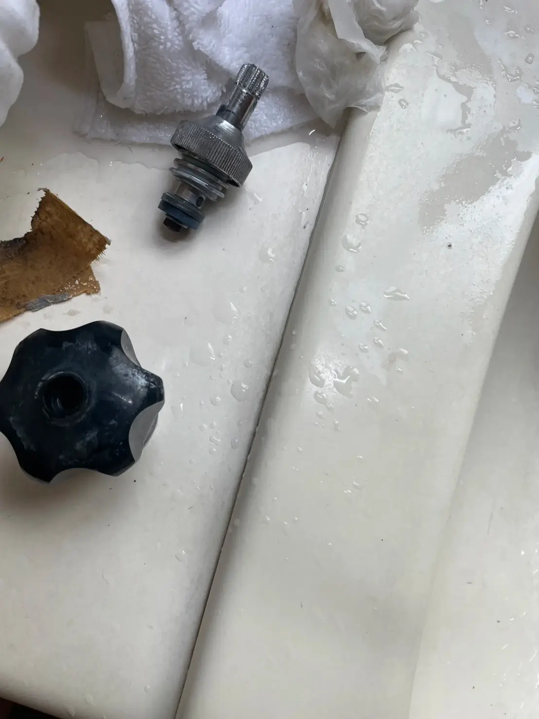 お伺いした際には、給湯器の水栓部分から水漏れがあり、内部のスピンドル(開閉を制御する軸部分)が摩耗している状態でした。