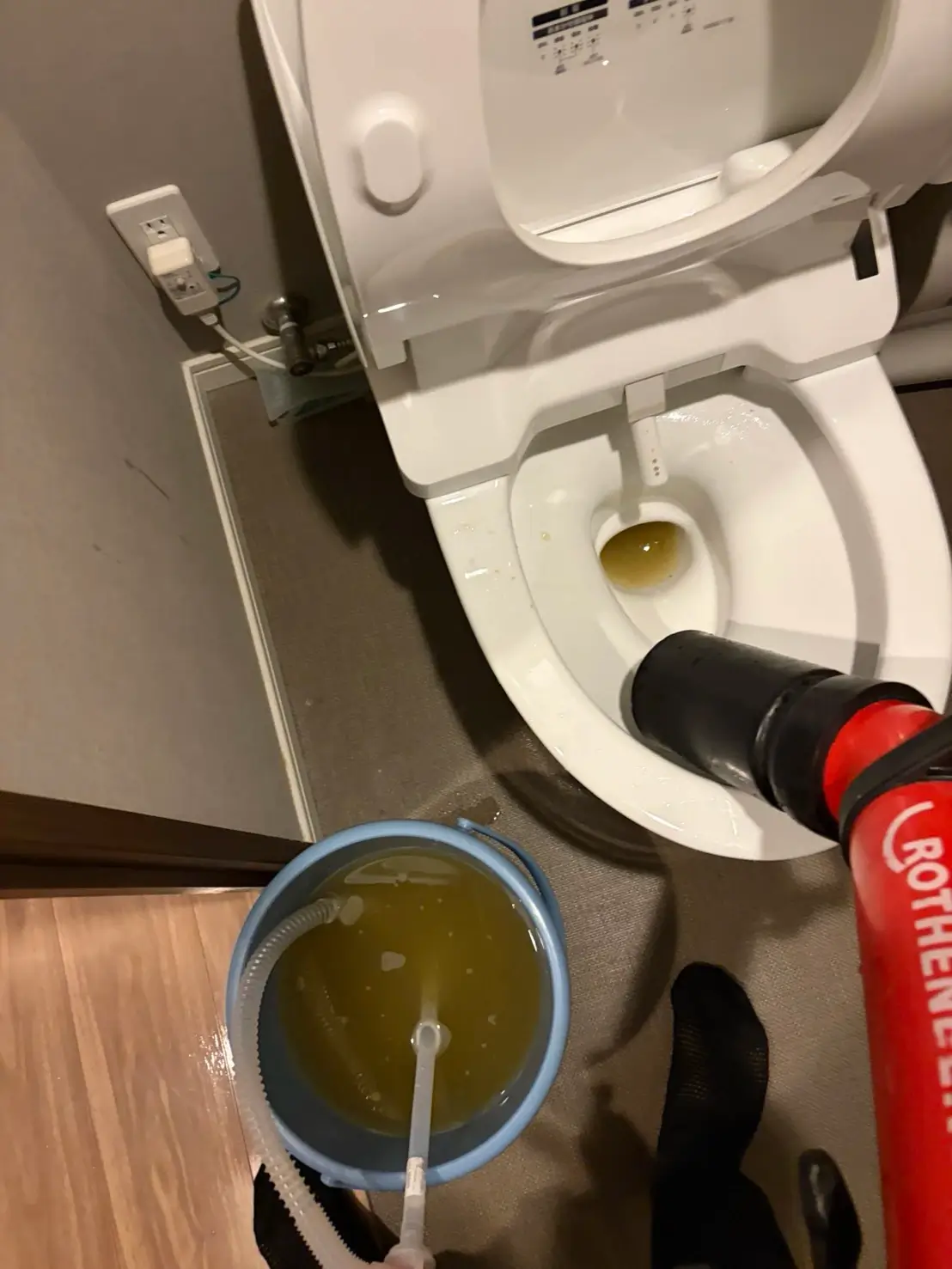 ローポンプで圧力をかけて詰まりを除去し、その後便器内の汚物を汲み取って通水確認を行っております。