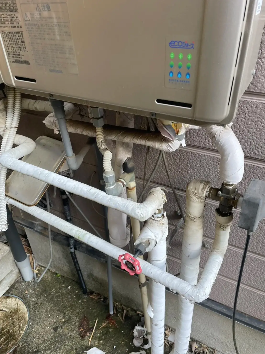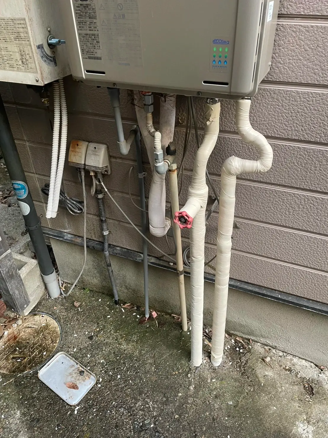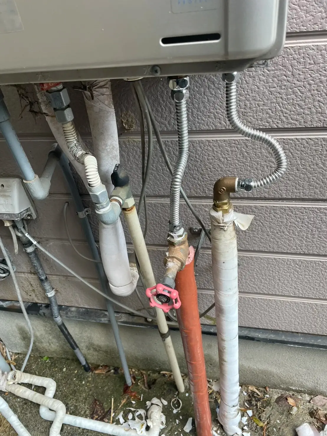 既存の給湯器に対し、給水管および給湯管の取り回しが合っておらず、経年劣化も見受けられる状態でした。