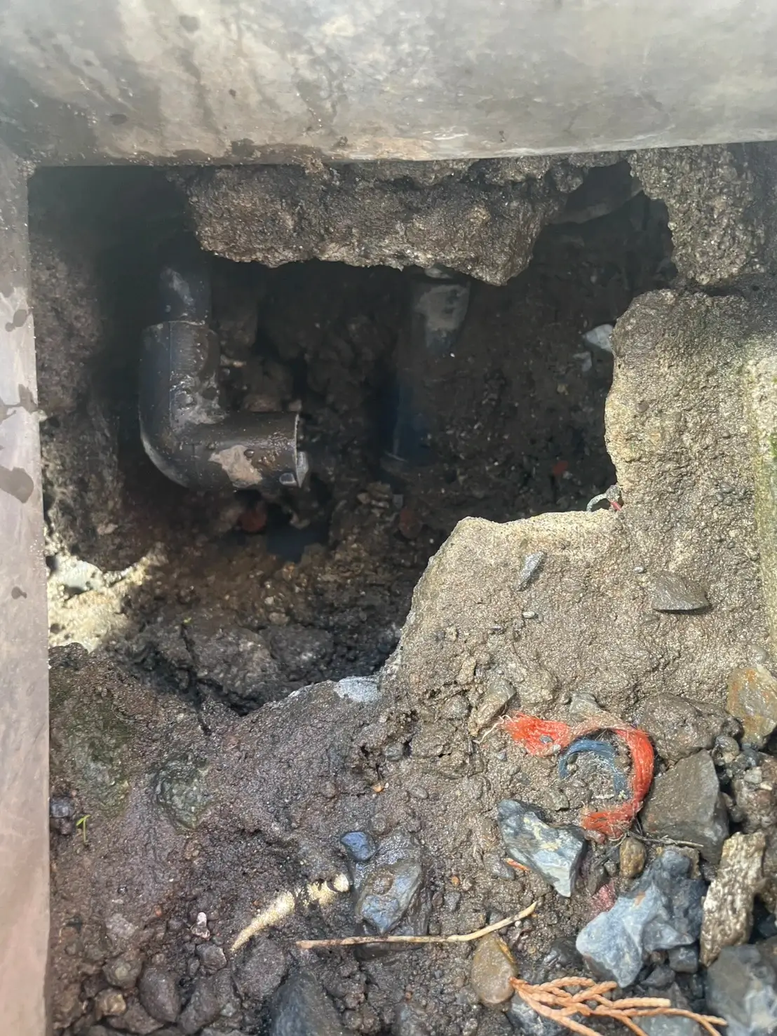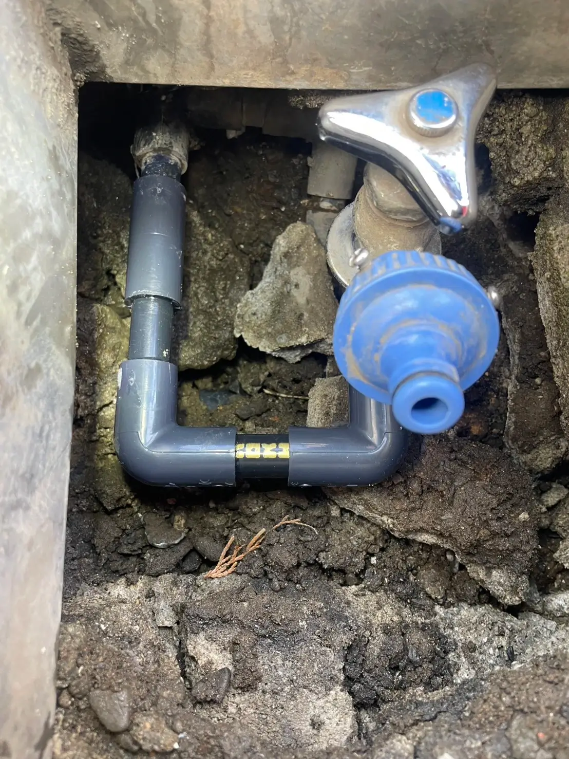 現場では屋外の蛇口が破損し、水が噴き出している状態でしたので、まずは止水作業を行い安全な状態へと整えました。